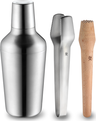 | 4-tlg.: | 1x Shaker mit Barsieb (Höhe ca. 24cm, Volumen ca. 0,7l), 1x Barmaß (für 2cl und 4cl), 1x Eiszange (ca. 21cm), 1x Buchenholzstößel (ca. 21cm) |